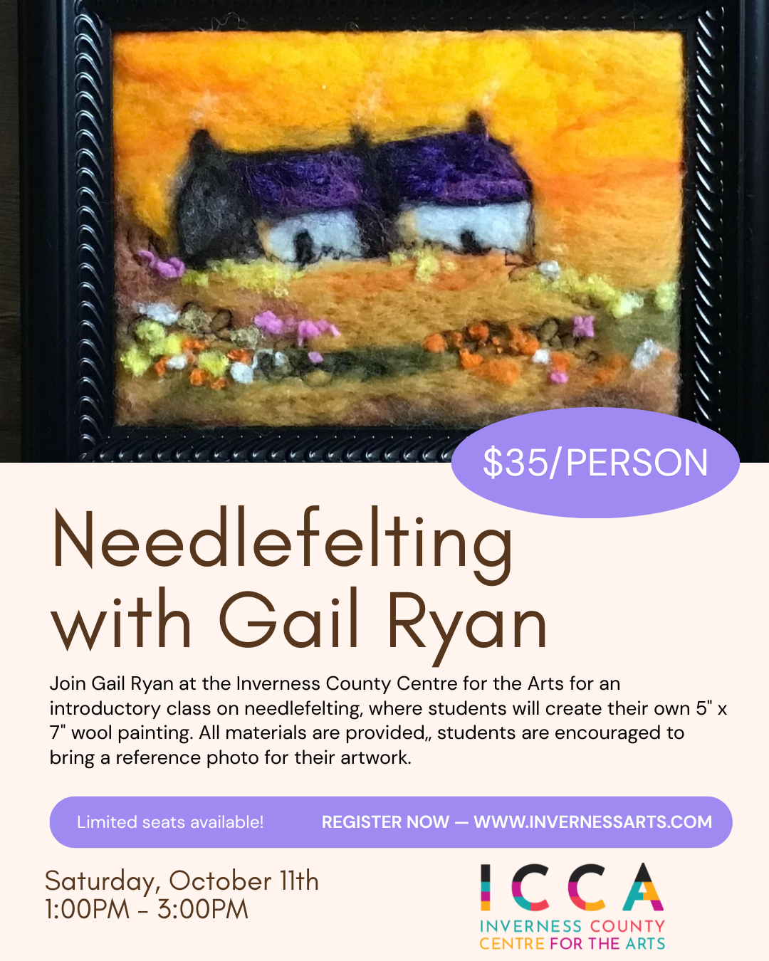 Join Gail Ryan at the Inverness County Centre for the Arts for an introductory class on needlefelting, where students will create their own 5" x 7" wool painting. All materials are provided,, students are encouraged to bring a reference photo for their artwork.